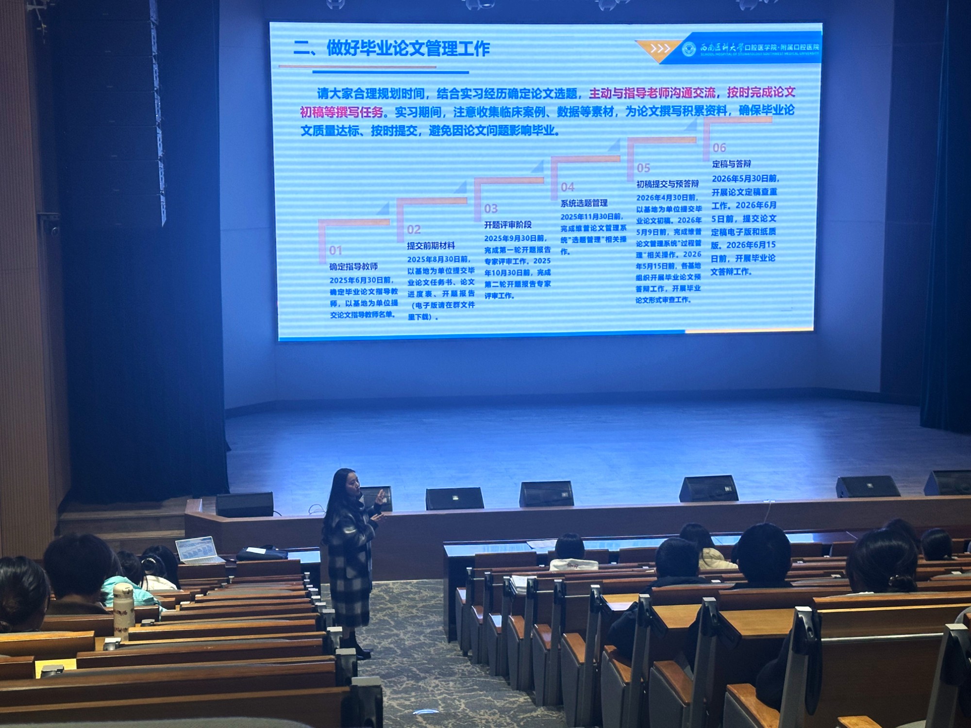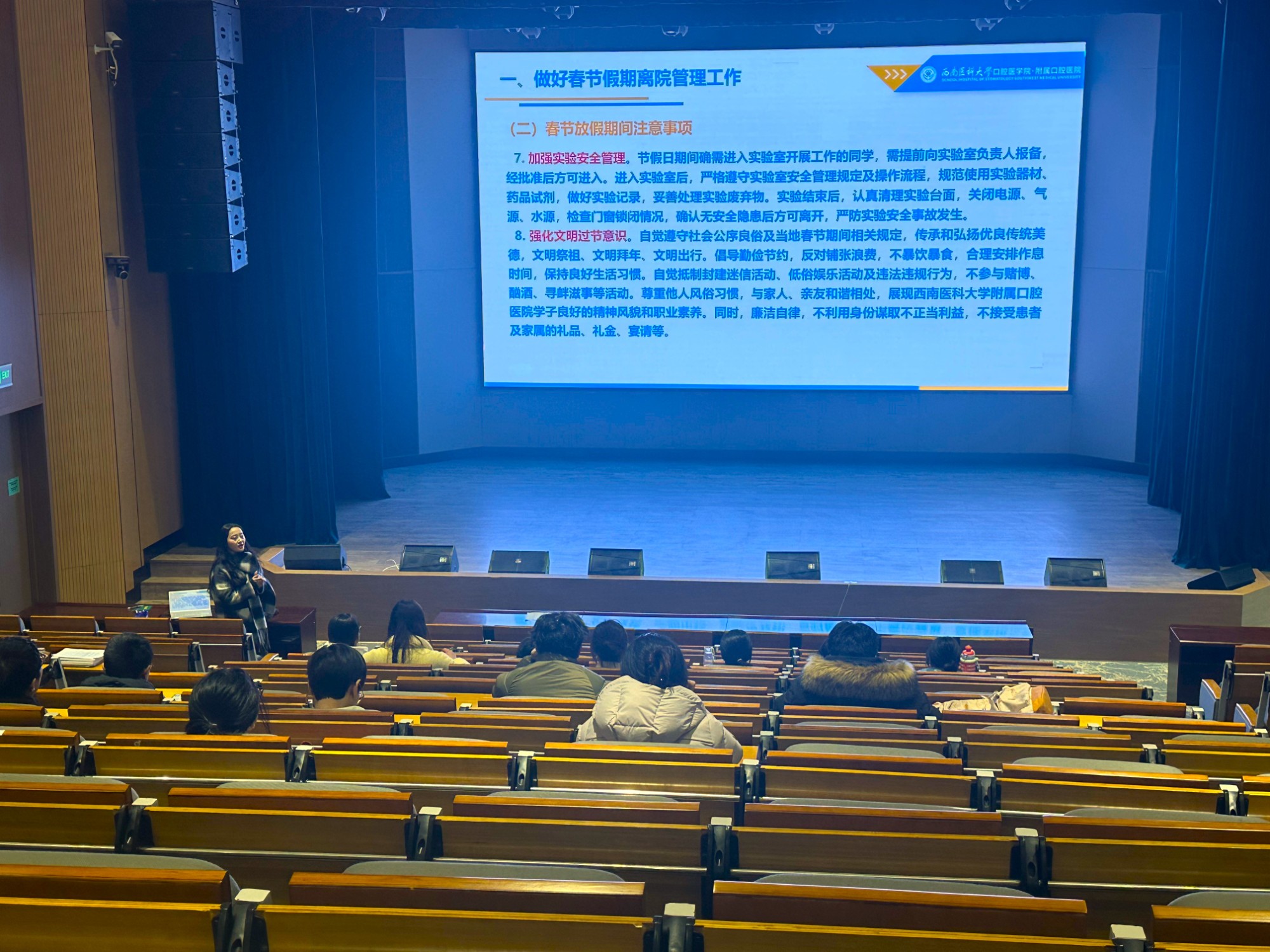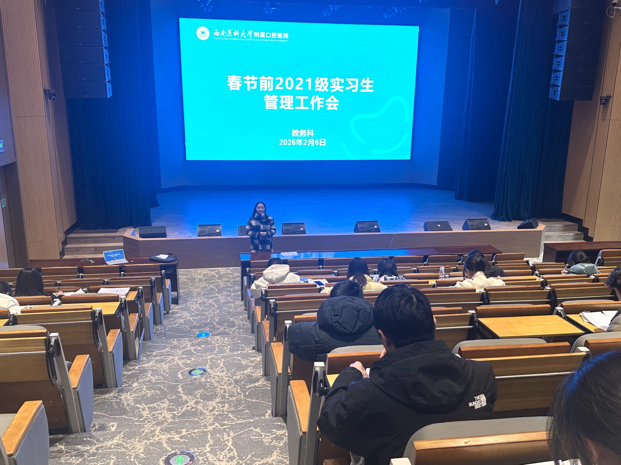为保障春节假期实习工作有序推进,规范实习管理、强化安全防范,2月6日下午,西南医科大学附属口腔医院召开2026年春节前实习管理工作会。教务科负责人主持会议并作工作强调,45名2021级口腔实习同学参会。